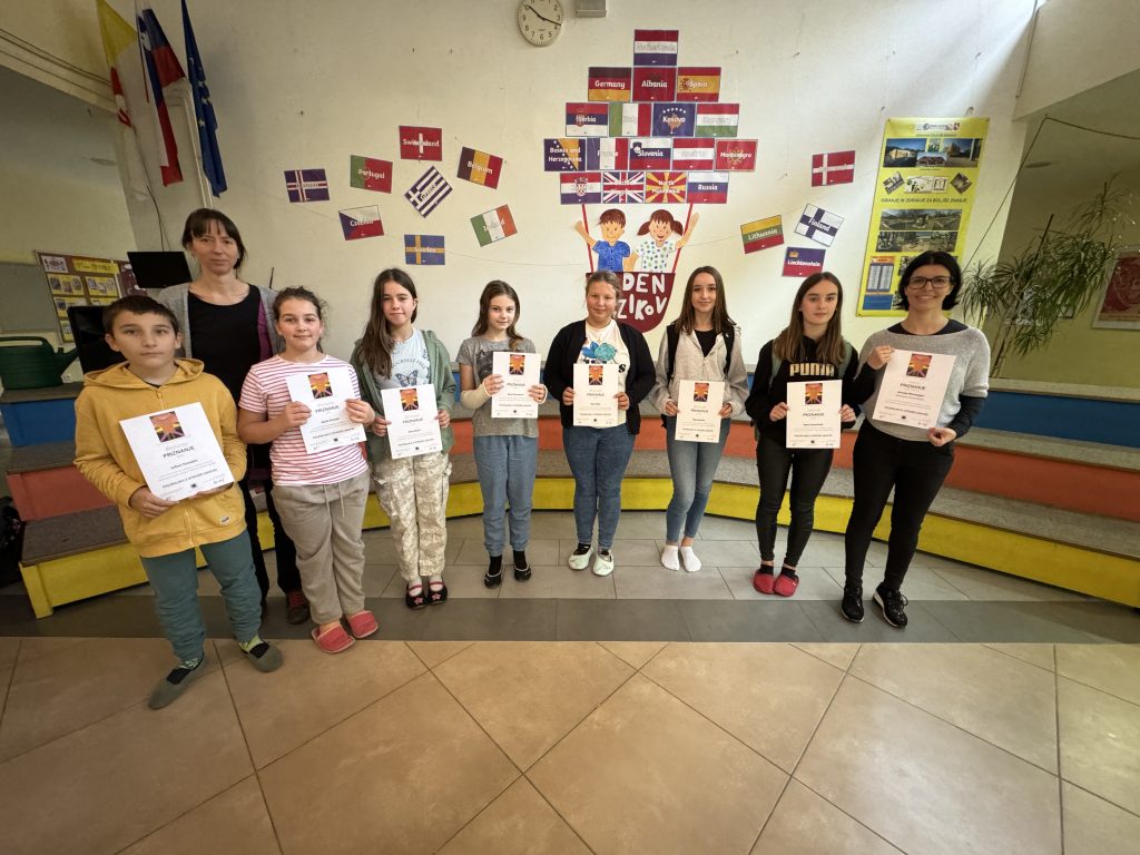 Učenka 6. razreda Ema Stanojevič je prejela najvišje – zlato priznanje, učenka Nuša Jeseničnik iz 8. razreda je prejela srebrno priznanje, učenci Urban Tomažin, Ema Rožič, Špela Hronek, Mia Ošlak (vsi 6. razred) ter Maja Kotnik iz 8. razreda pa so prejeli bronasta priznanja. Vsem nagrajenim učencem iskreno čestitamo.