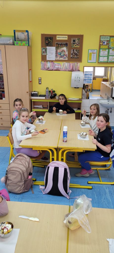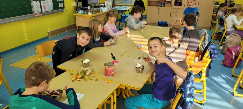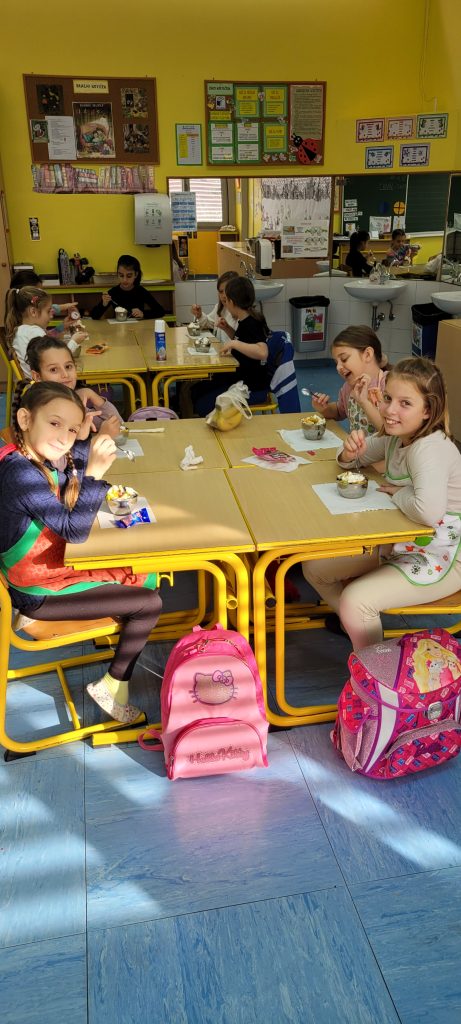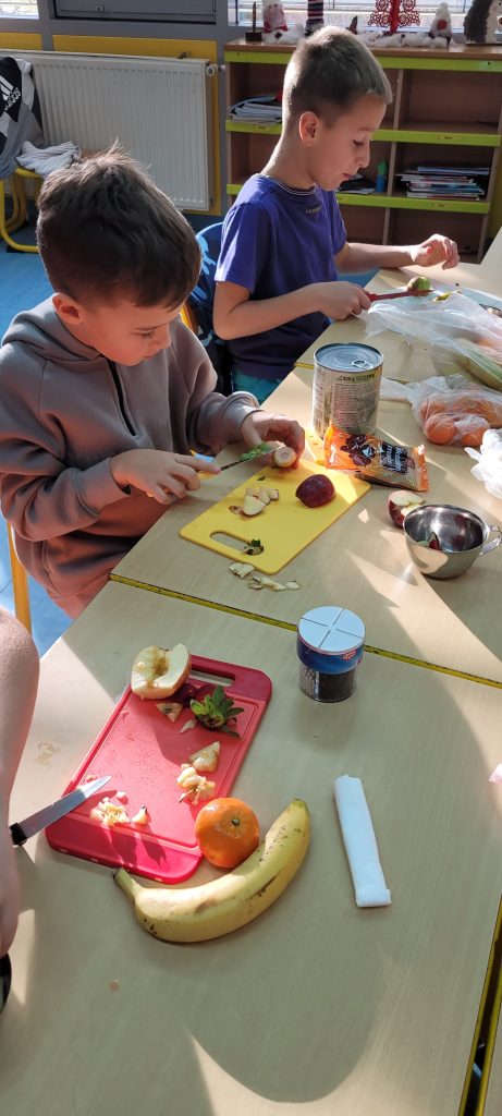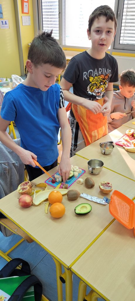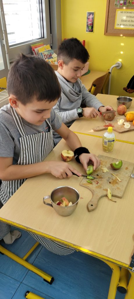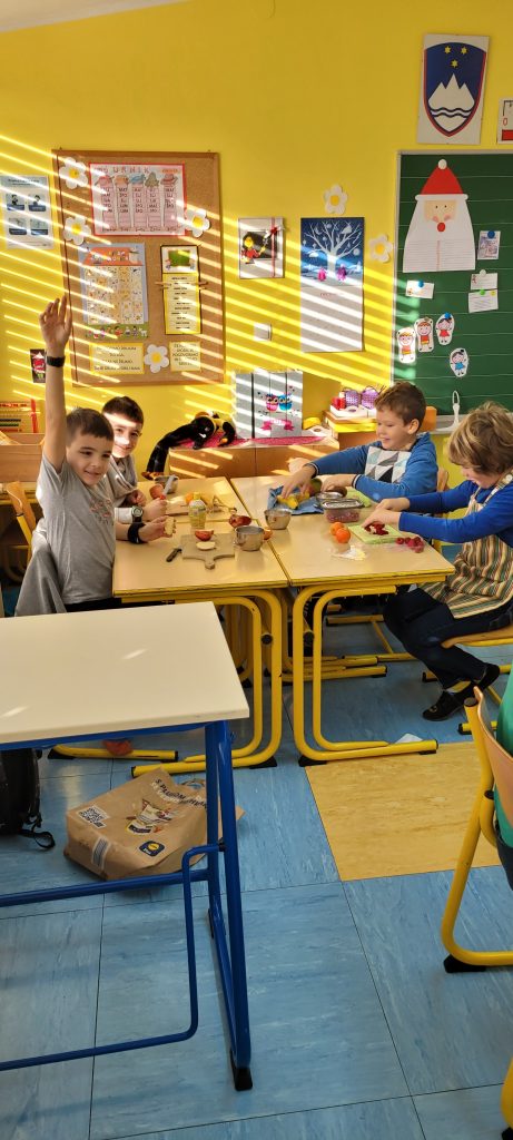 V torek, 12. 12. 2023, smo imeli učenci 3. razredov naravoslovni dan z naslovom Priprava zdravega obroka. Pripravljali smo sadno kupo. Od doma smo prinesli svoje najljubše sadje. V šoli smo si nadeli predpasnike, umili roke in se lotili lupljenja in rezanja sadja. Ko so bile naše posodice polne zdravih in vitaminov polnih koščkov sadja, smo jih tudi okrasili s sladko smetano in pisanimi mrvicami. Pri delu smo zares uživali, prav tako pa tudi pri sladkanju z okusno sadno kupo.