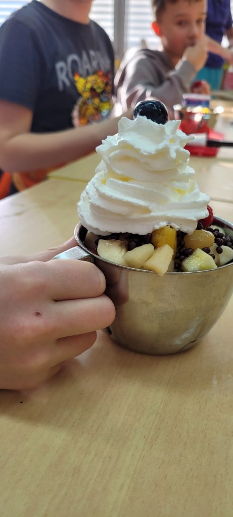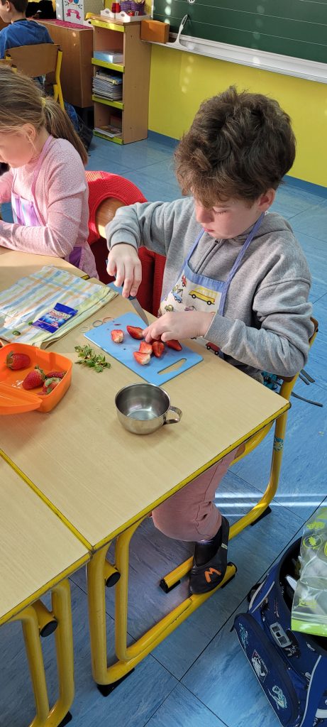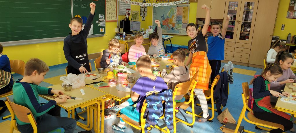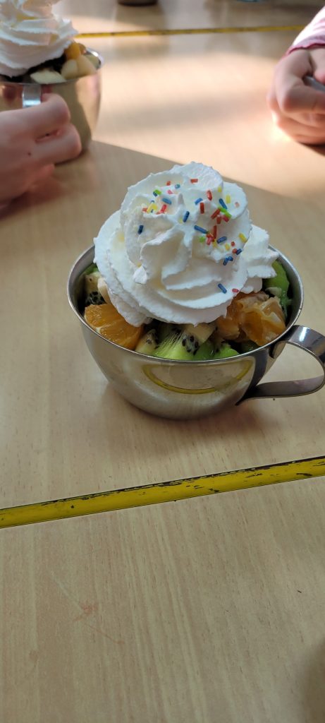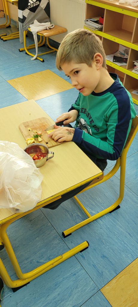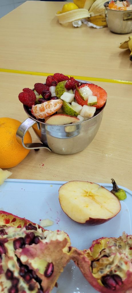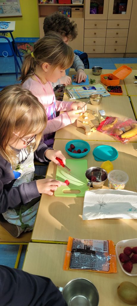 V torek, 12. 12. 2023, smo imeli učenci 3. razredov naravoslovni dan z naslovom Priprava zdravega obroka. Pripravljali smo sadno kupo. Od doma smo prinesli svoje najljubše sadje. V šoli smo si nadeli predpasnike, umili roke in se lotili lupljenja in rezanja sadja. Ko so bile naše posodice polne zdravih in vitaminov polnih koščkov sadja, smo jih tudi okrasili s sladko smetano in pisanimi mrvicami. Pri delu smo zares uživali, prav tako pa tudi pri sladkanju z okusno sadno kupo.