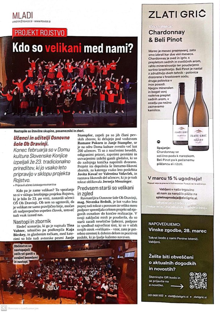 Učenci in učitelji Osnovne šole Ob Dravinji so 27. februarja 2025 v Domu kulture Slov. Konjice izpeljali že 23. tradicionalno prireditev, ki jo vsako leto pripravijo v okviru projekta Rojstvo.