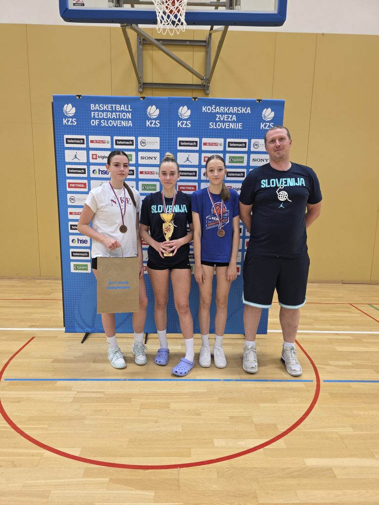 V skupinskem delu so najprej le za točko izgubile proti vrstnicam z OŠ Matija Čopa Kranj, premagale pa so OŠ Tolmin. Tako so se v osmini finala pomerile z domačinkami – OŠ Alojzija Šuštarja. Celotno tekmo so vodile, proti koncu pa so domačinke z uspešnimi meti izza črte izsilile podaljšek. V podaljšku so bile uspešnejše naše učenke. V četrtfinalu so naše učenke premagale vrstnice z OŠ Podbočje. V polfinalni tekmi pa so jim nasproti stale zmagovalke turnirja iz Postojne, ki so jim naše učenke morale priznati premoč. V tekmi za 3. mesto so se ponovno pomerile z učenkami iz Kranja. Tokrat so jih z agresivnejšo in učinkovitejšo igro v napadu zanesljivo premagale. Tako so usvojile odlično 3. mesto v državi. Aljaši Sodin, Mili Krošl in Neži Petraš čestitamo.