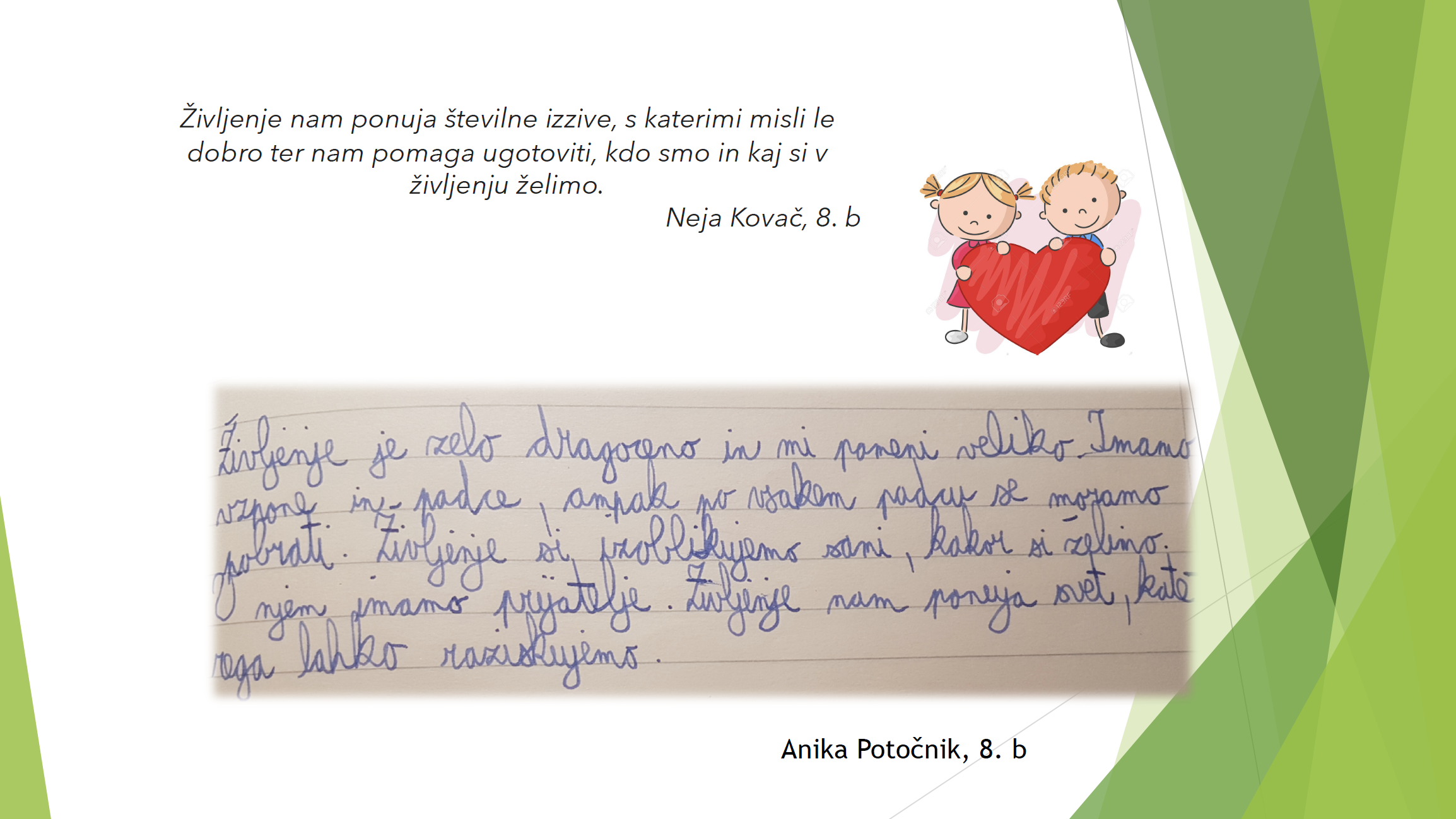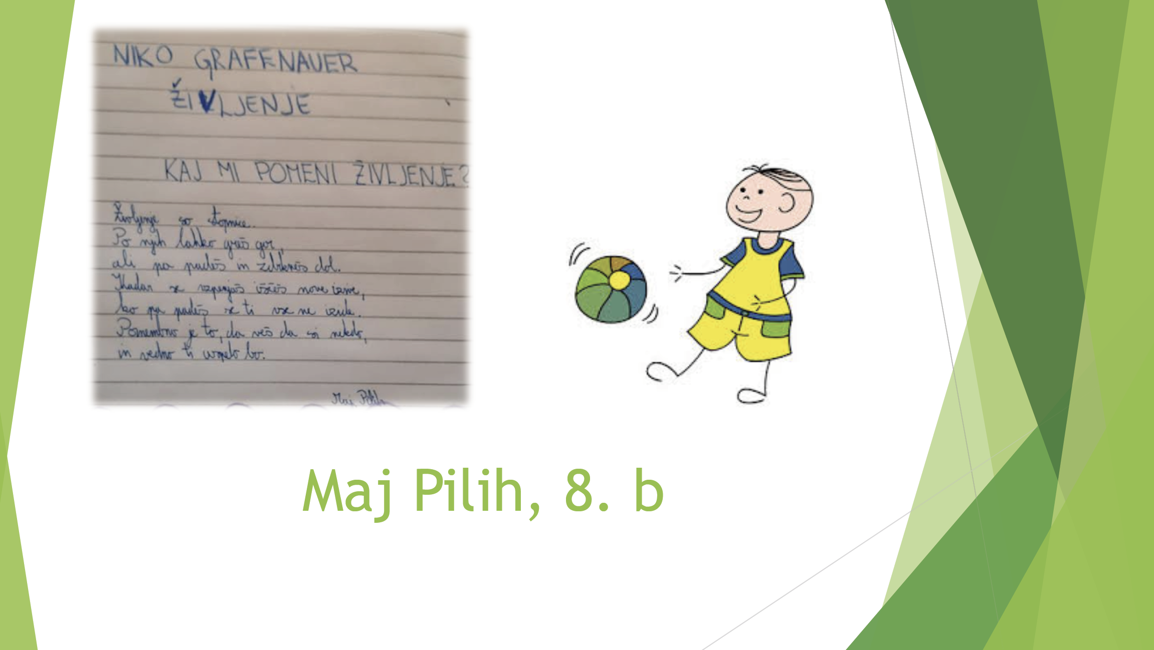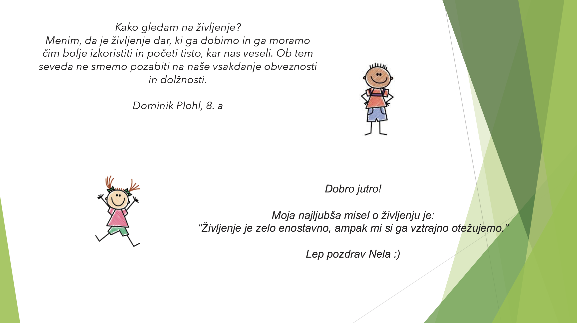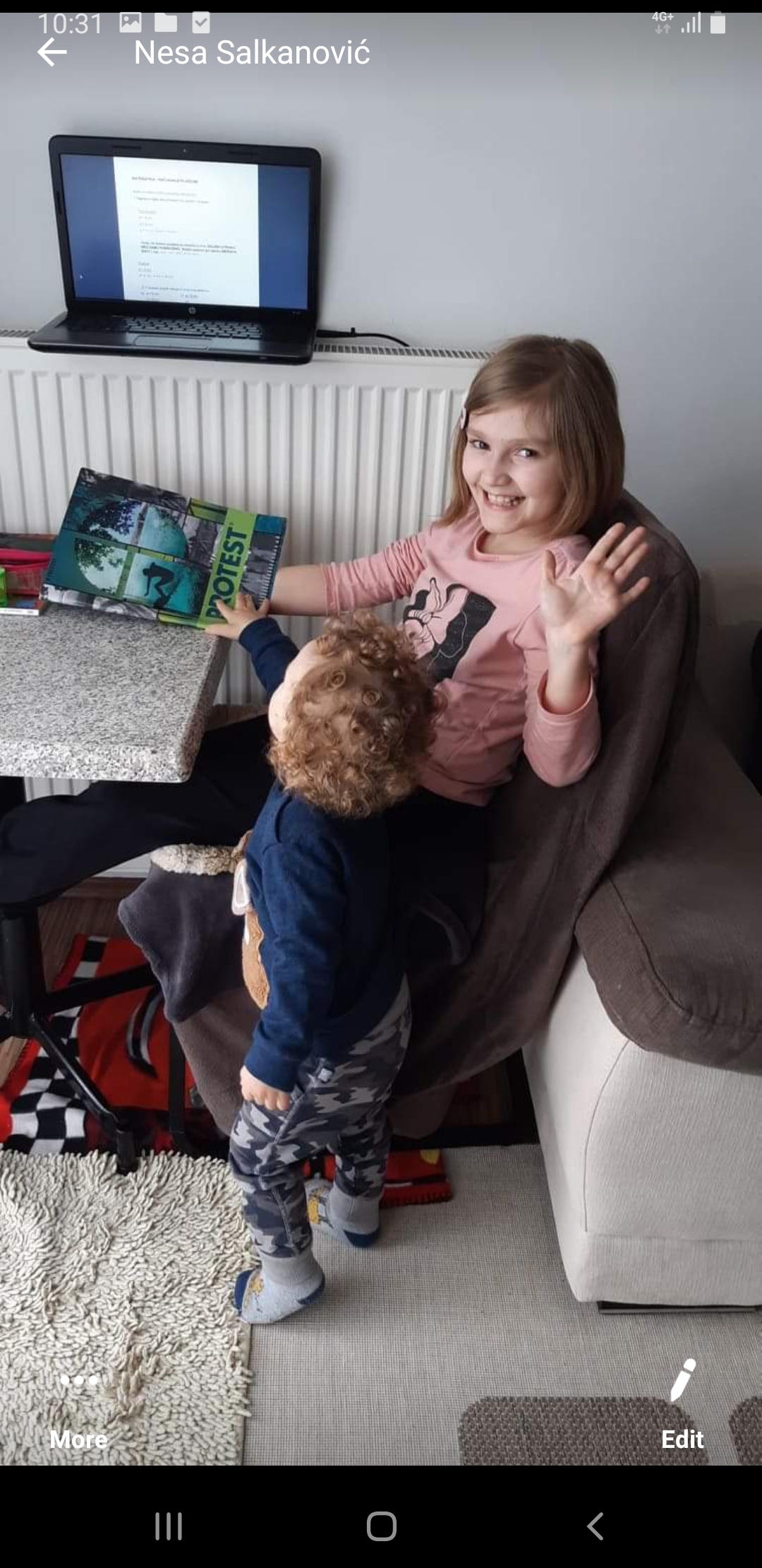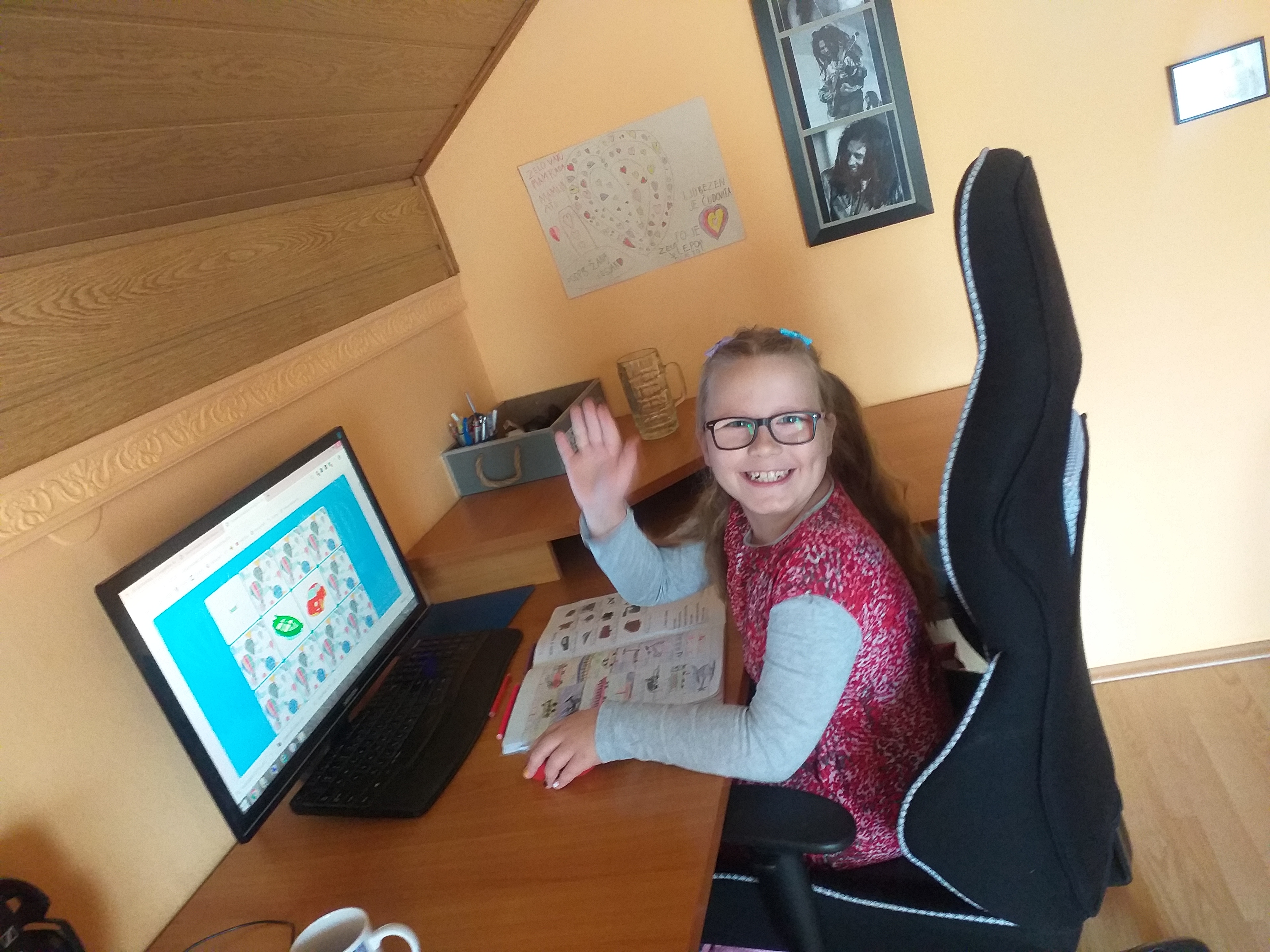 - NIKA iz 1. b-razreda pravi, da ji je všeč učenje na daljavo, ker dobi navodila preko računalnika, da lahko dalj časa spi, da si lahko vzame več odmorov. Ni pa ji fino to, da ne vidi prijateljev, ki jih že zelo pogreša.