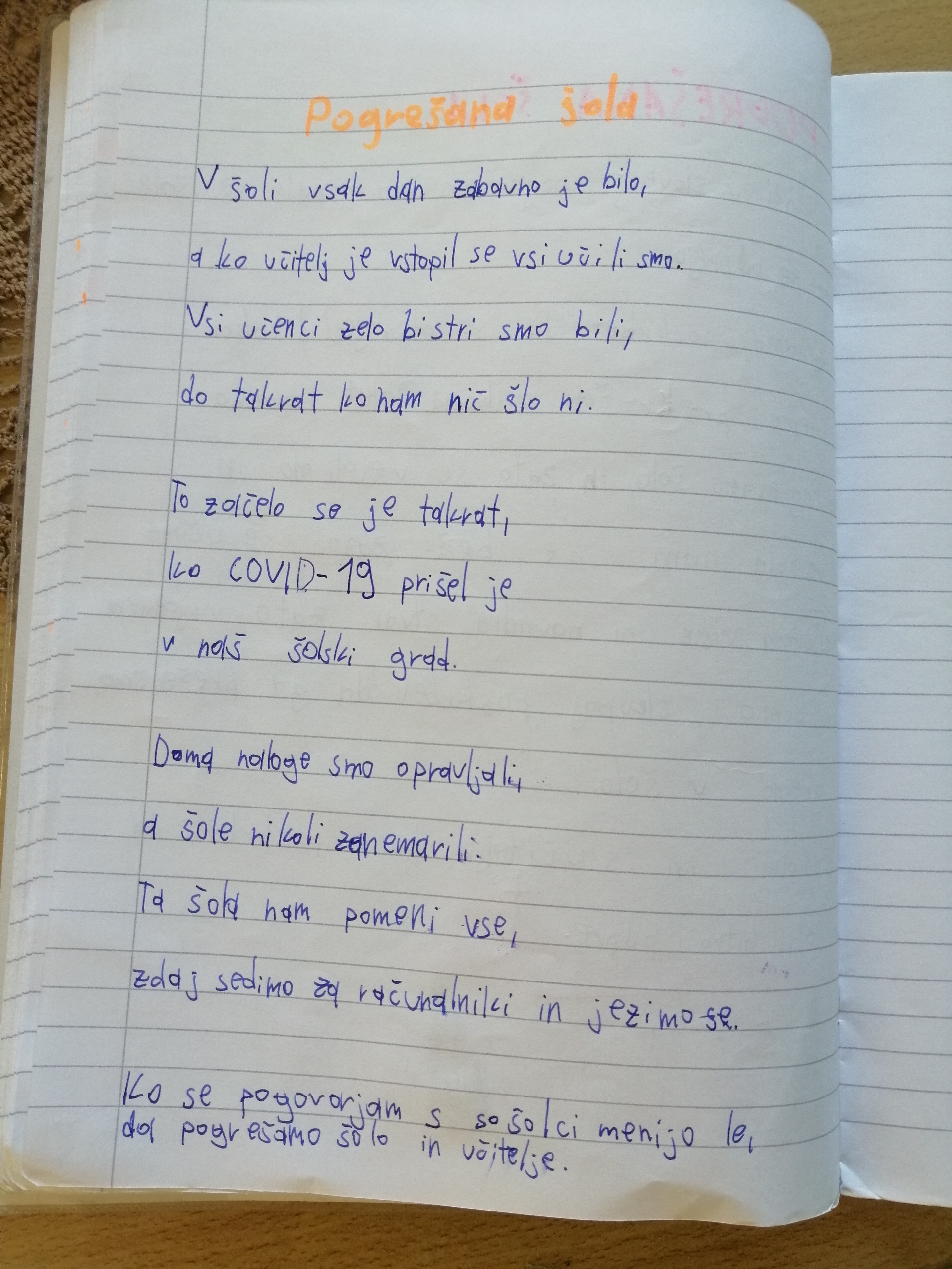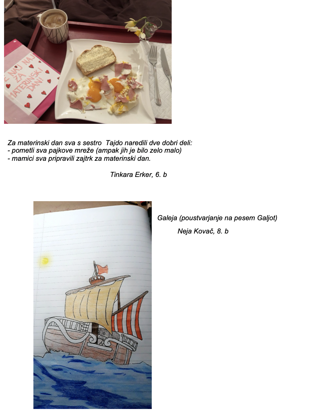 Podelimo skupaj nekaj utrinkov in misli učenja na daljavo. Prepričana sem, da drug drugega že zelo pogrešamo, vsi pa se trudimo po najboljših močeh. Šolsko leto 2019/2020 nam je pripravilo zanimive izzive, na katere nihče od nas ni bil pripravljen. A verjemite, skupaj nam bo uspelo!