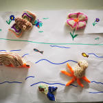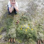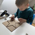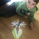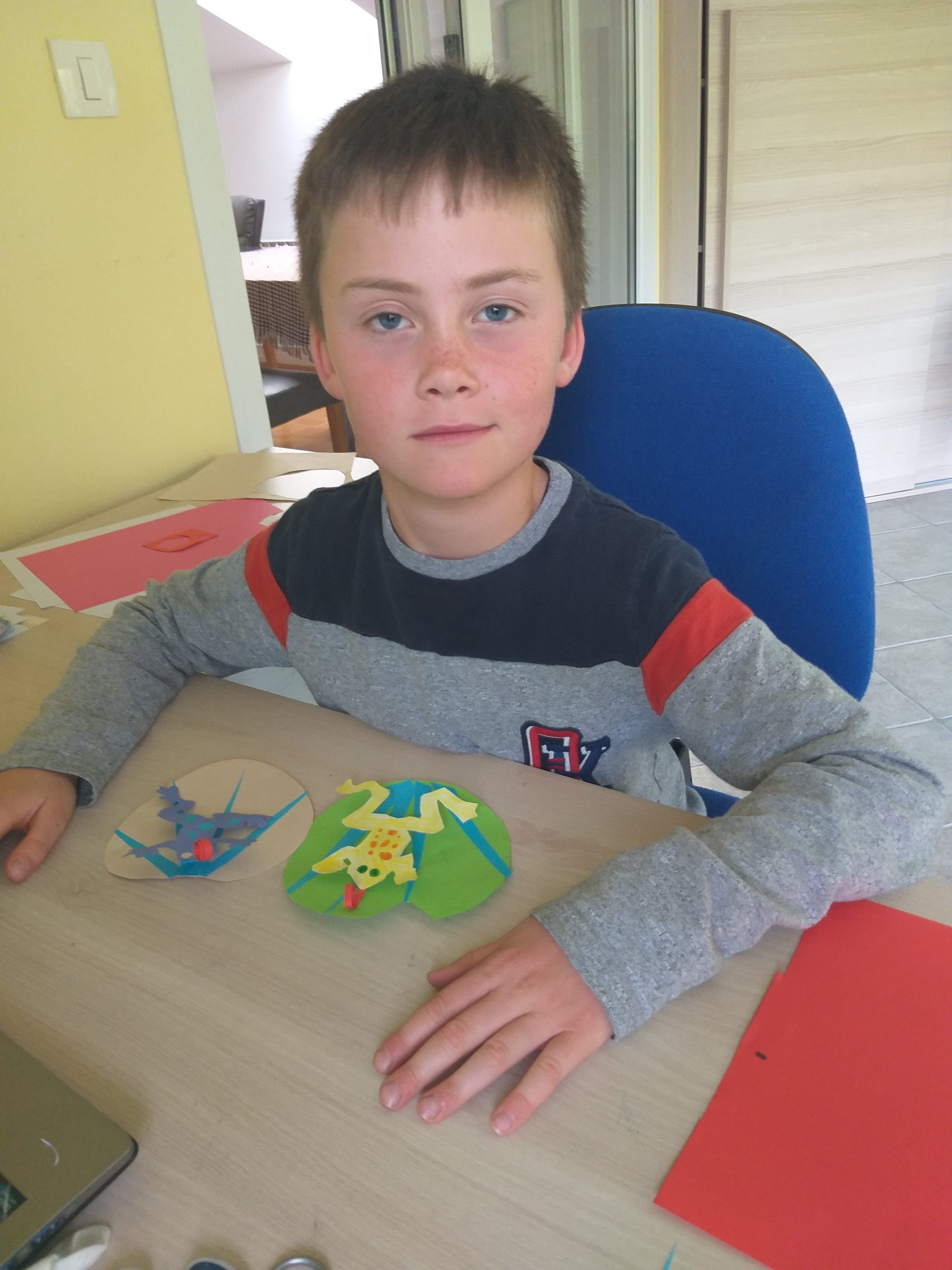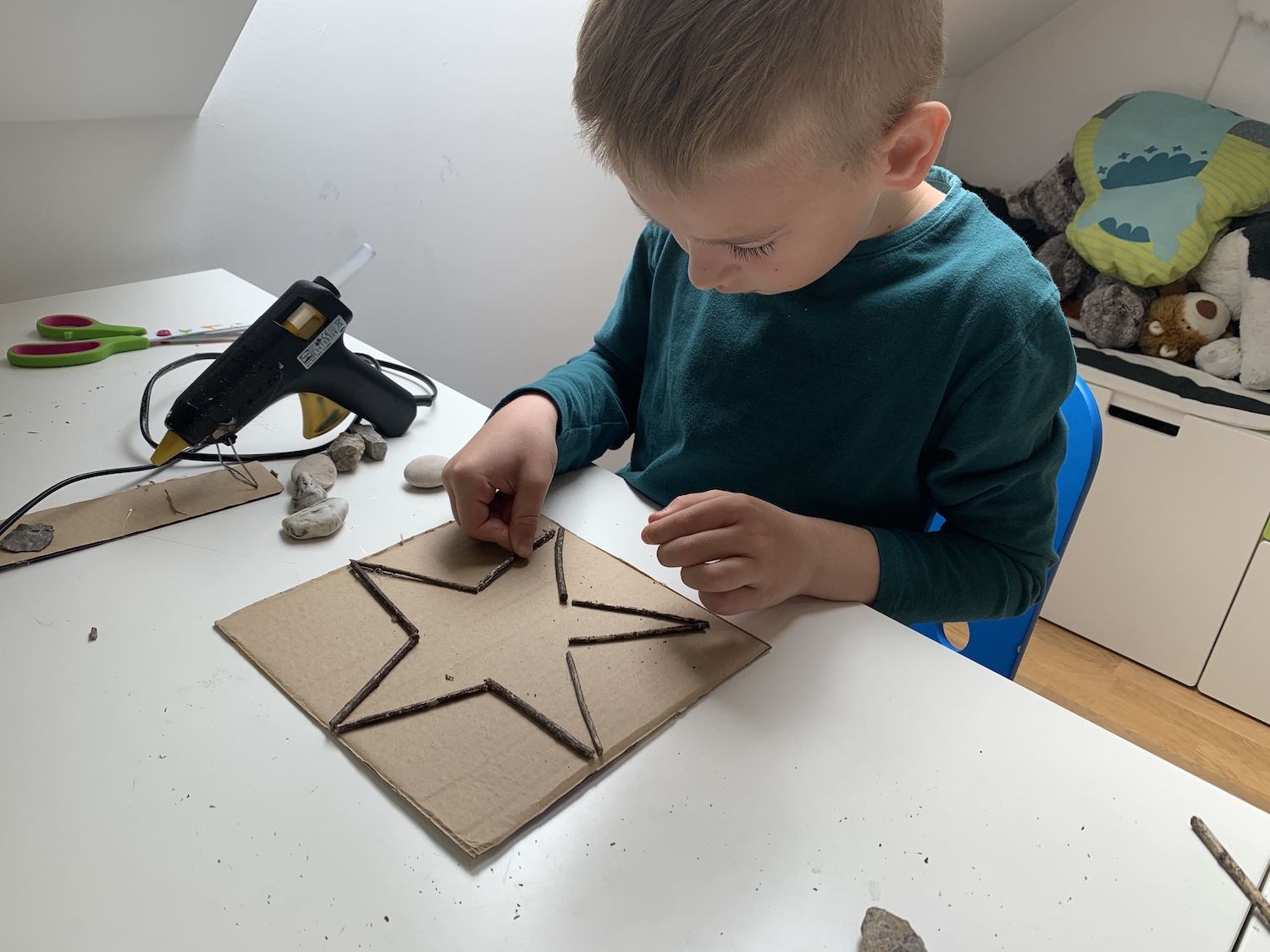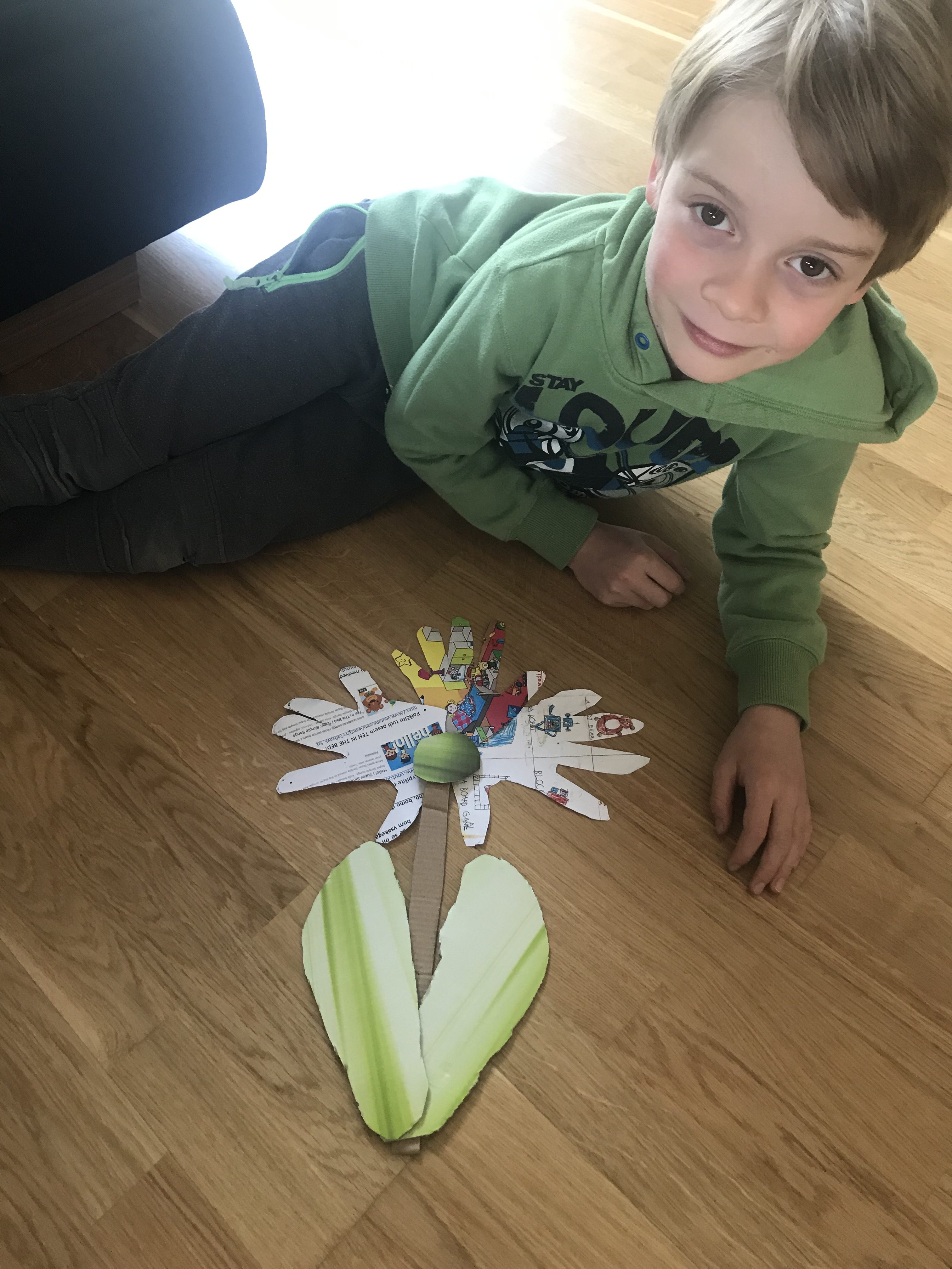 - Andrej pri sortiranju različnih odpadnih materialov. Vid je izdelal rožo z obrisi svoje dlani. (1.b)