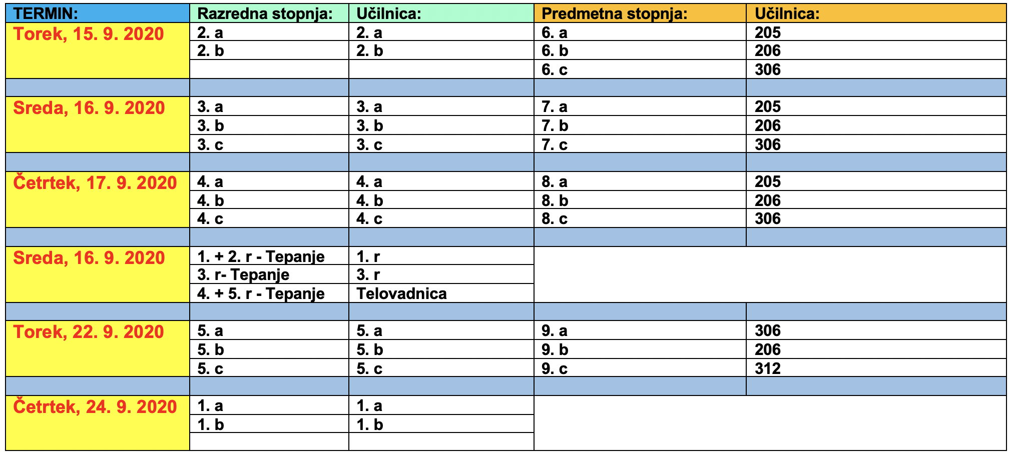- oddelki od 1. do 5. razreda in 9. razredi izvedejo roditeljski sestanek v MATIČNIH UČILNICAH.