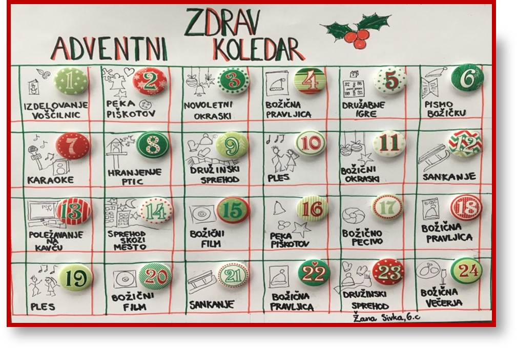 Učenci in učitelji smo v sklopu Eko šole, Zdrave šole in krožka Rdečega križa pripravili kar nekaj različnih adventnih koledarjev, dva pa vam tudi predstavljamo. Prvi je namenjen prijaznosti in dobrim delom, drugi pa gibanju. Prepričani smo, da vam bosta všeč oba.