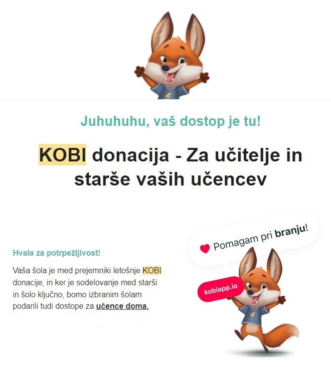 Tako smo prejeli brezplačen dostop za aplikacijo KOBI – aplikacijo za učenje in trening branja za šolsko leto 2022/2023. Brezplačen dostop je omogočen tudi učencem doma.