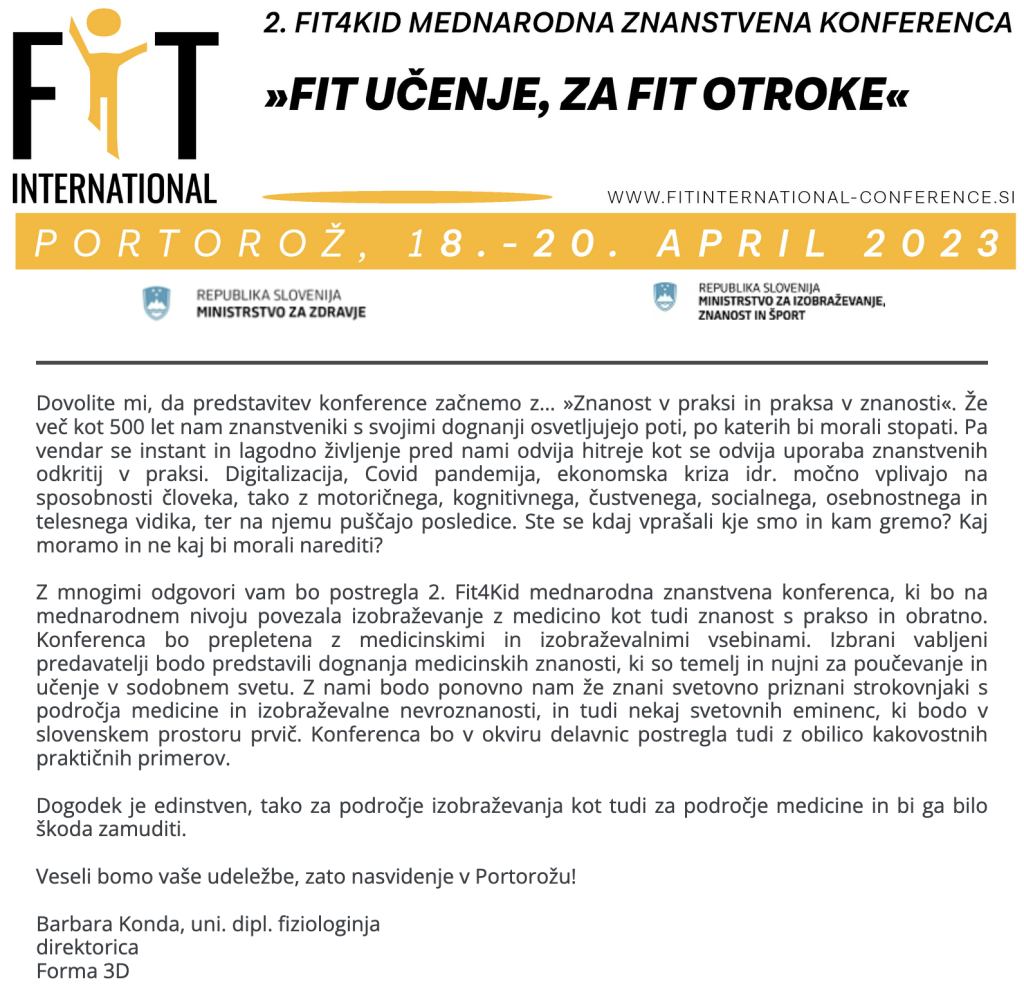 Kot šola, ki je vključena v projekt FIT4KID INTERNATIONAL, smo veseli, da bomo v okviru mreže FIT4KID šol ponovno deležni izjemnega dogodka na področju izobraževanja, ki se bo odvijal v Sloveniji – 2. FIT4KID MEDNARODNE ZNANSTVENE KONFERENCE, na kateri bodo prisotni izjemni strokovnjaki s področja nevroznanosti.
