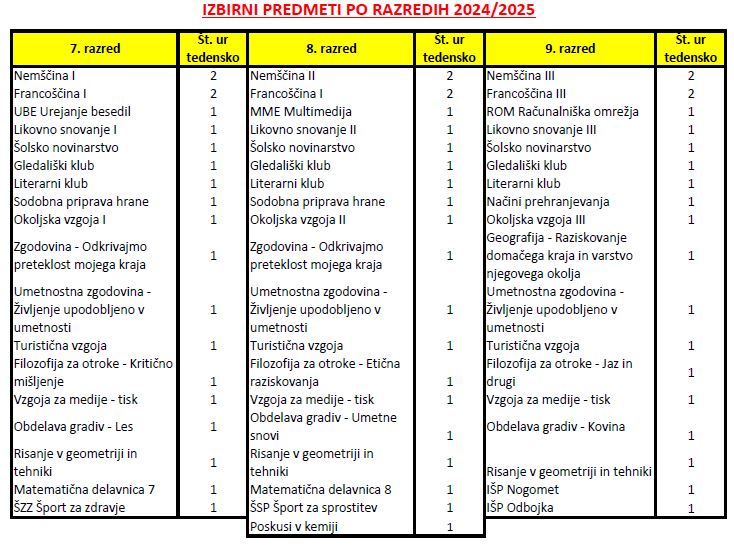 Poleg obveznih predmetov imajo učenci v 7., 8. in 9. razredu tudi IZBIRNE PREDMETE iz: