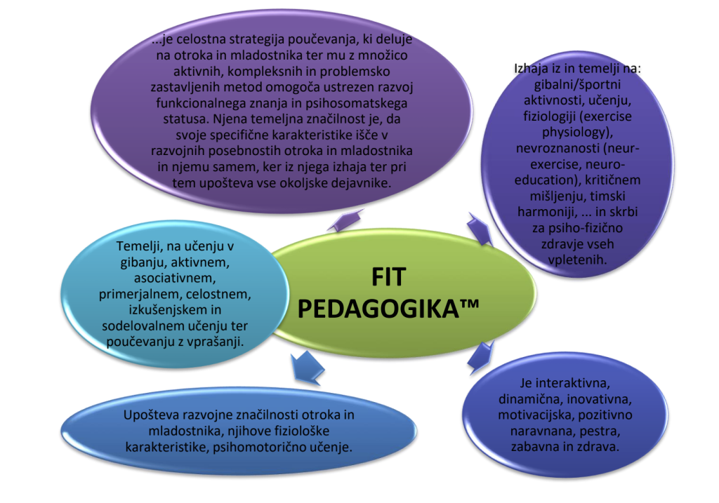Fit pedagogika temelji na učenju v gibanju in strategijah učenja (aktivno, asociativno, primerjalno, izkustveno, celostno, sodelovalno in kritično učenje), fiziologiji, nevroznanosti in izobraževalni nevroznanosti ter išče svoje specifične karakteristike v razvojnih posebnostih otroka in mladostnika ter v njem samem, saj iz njega izhaja. Ne izpostavlja neuspehov, temveč poudarja pomembnost majhnih uspehov. Dosežki otrok in mladostnikov se namreč začnejo že s “pripravljenostjo poizkusiti”. Sami se preizkušajo, učijo na reševanju napak, raziskujejo svoje lastne sposobnosti in omejitve, kar jih vodi k obvladovanju različnih nalog. Poleg vsega navedenega pa je Fit pedagogika sodobna, dinamična, inovativna, zabavna, pestra, motivacijska, zdrava in pozitivna učna strategija.