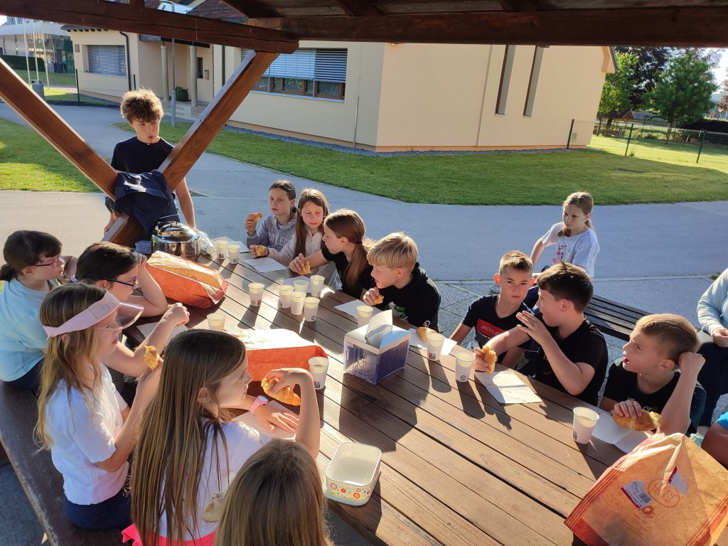 V petek, 15. novembra 2024, so šole in vrtci po vsej Sloveniji obeležili že 14. izvedbo Tradicionalnega slovenskega zajtrka, letos pod sloganom »Tradicionalni slovenski zajtrk – moj naj zajtrk!«. Projekt tokrat ni imel v ospredju specifičnega živila, ampak je dal poudarek na pomen vključevanja lokalno pridelanih in predelanih živil v našo prehrano, kar spodbuja našo samooskrbo in kratke oskrbne verige. Na podružnici smo imeli na ta dan naravoslovni dan. Učenci so najprej prisluhnili šolskemu radiu in skupaj zapeli znano pesem ansambla Lojzeta Slaka – Čebelice. V nadaljevanju so si najprej privoščili tradicionalni slovenski zajtrk, sestavljen iz lokalno pridelanega mleka, meda, masla, kruha in jabolk, nato pa nadaljevali z različnimi dejavnostmi.